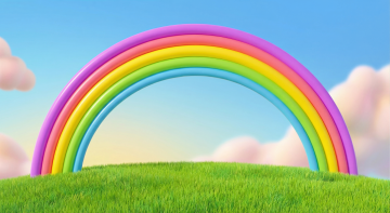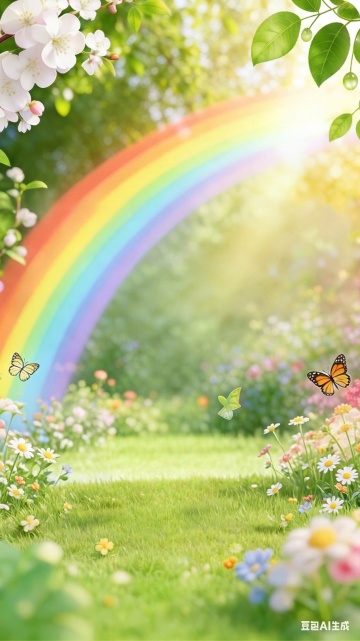 梦幻彩虹横跨清新田园,插画风虚拟自然,色彩斑斓,生机盎然。