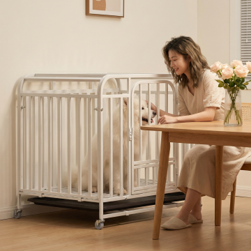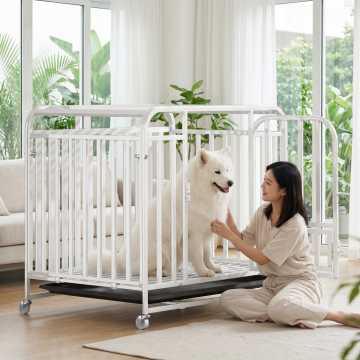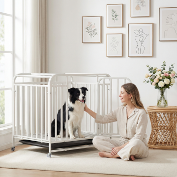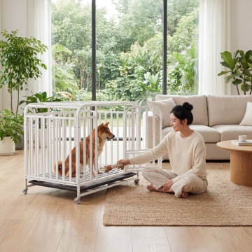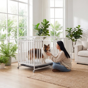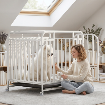 类似参考图片,一位女士在阳光客厅和白色狗笼里的比熊互动,温馨暖光风格,保留白色狗笼产品主体,更换不同场景、不同女士人物,笼子里是比熊,图片比例1:1