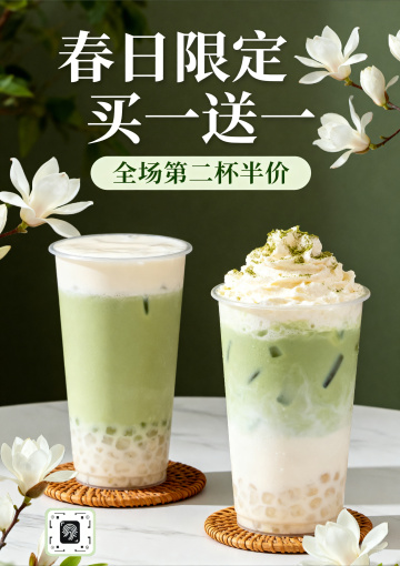 春日奶茶店促销海报,风格清新治愈,配色为淡绿色、浅粉色和天蓝色,搭配樱花元素,主标题文案是"春日限定买一送一",副标题文案是"全场第二杯半价",简约排版,高清商用品质,整体氛围温馨清新。