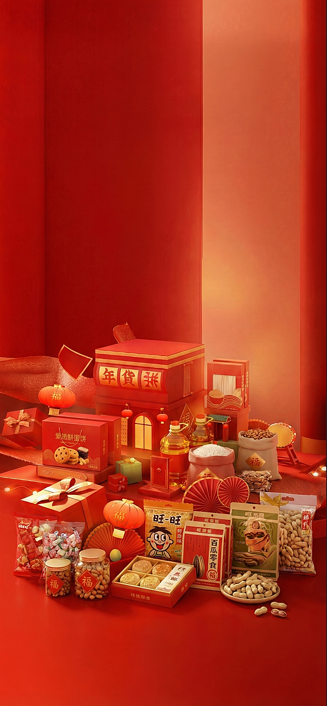 国潮风与重拟物结合,红金配色凸显喜庆感,塑料质感麻将堆叠成塔,搭配坚果罐与春联,营造浓厚中式实景氛围,印刷风标签强化节日视觉。详情