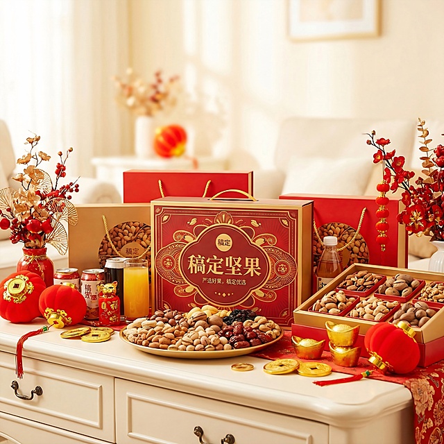 电商主题海报,纯画面图,不需要添加文字;核心元素:年货组合(坚果礼盒、零食包装、饮品,商品名称稿定坚果)、背景,春节氛围下的奶油风客厅内茶几上摆放着年货组合;背景奶油风室内客厅。构图:年货组合居画面中下部作视觉焦点,前面坚果摆盘丰富,紧凑,茶几上作新春装饰环绕烘托氛围,视觉热闹且突出产品。感饱满(年货包装细节、装饰元素光泽、背景氛围),传递热闹年味。产品之间的距离紧凑一些;画面背景简约,颜色色系统一;画面色彩:正红 + 鎏金 + 坚果暖棕为主,色调浓郁喜庆。拍摄角度:低角度,以坚果礼盒为视觉中心。背景虚化。详情