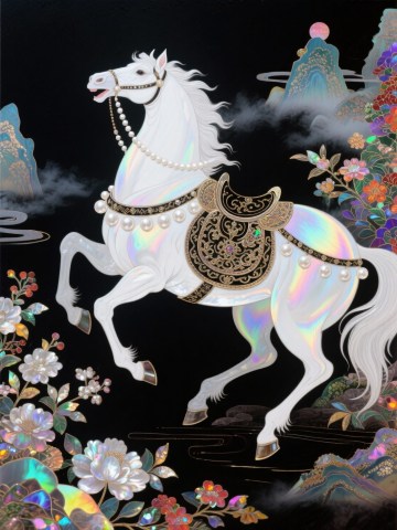 工笔风白骏立于墨色山水间,鎏金饰带缀以珍珠,幻彩肌理流转,花枝繁盛,刺绣质感与国潮元素交织,尽显奢华、唯美的中式梦幻意境。