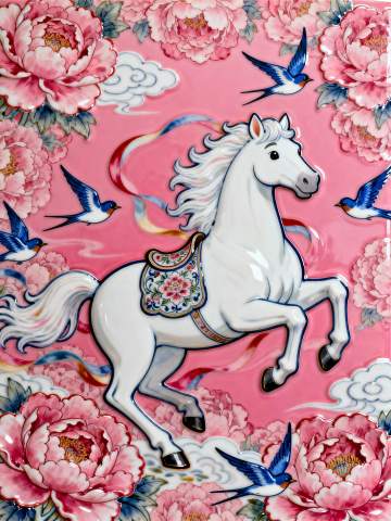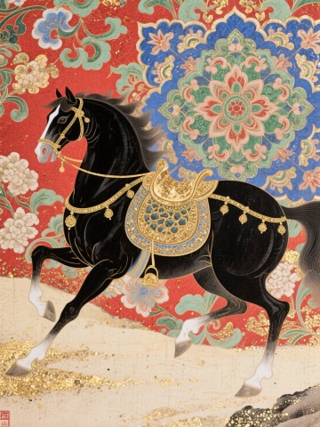 工笔风骏马,融国潮与鎏金元素,刺绣纹样华丽,浮雕质感凸显古典奢华,红金配色尽显喜庆祥瑞。