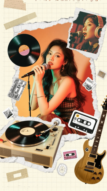 时尚潮流city pop风,杂志感十足,豹纹上衣搭配牛仔裤,复古唱片店背景。