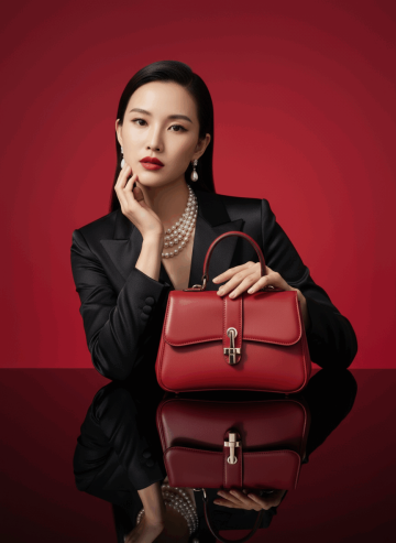 复古港风氛围,一位穿红裙女性,卷发蓬松有光泽,妆容惊艳,红唇,精致眼妆,姿态慵懒,手托腮,持黑色高跟鞋。背景带朦胧怀旧夜景,色调暖黄复古,营造80年代港风电影感