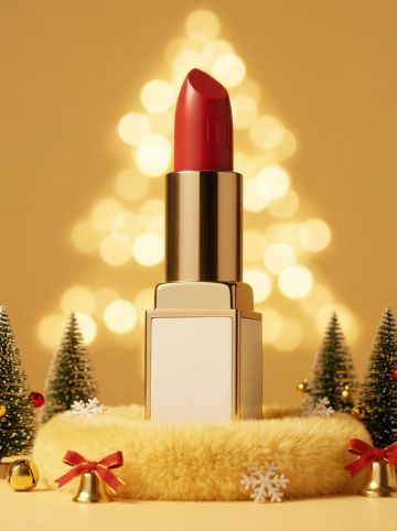 暖黄绸缎、蝴蝶结与柔和光影交融,搭配口红粉调、瓶身金棕,营造出优雅华贵又温暖的氛围,尽显美妆品精致感。