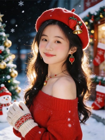 圣诞主题双色针织穿搭,红绿撞色搭配毛绒鹿角发饰,轻拟物风与面料质感结合,营造喜庆、甜美、温馨的节日实景氛围。