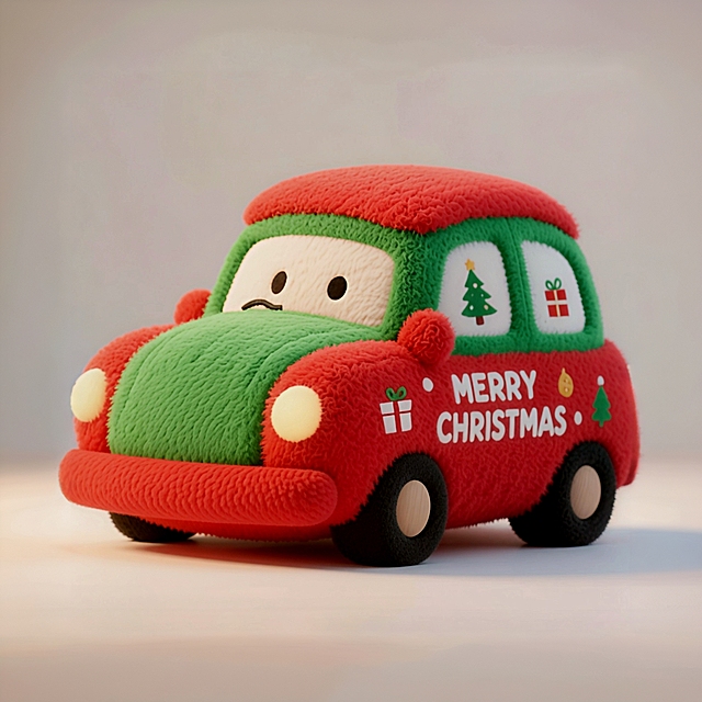 软3D粘土风格圣诞场景,卡通感十足的圣诞老人驾驶红色小车,挥手致意,充满喜庆与童趣,背景雪花点缀,节日氛围浓厚。详情