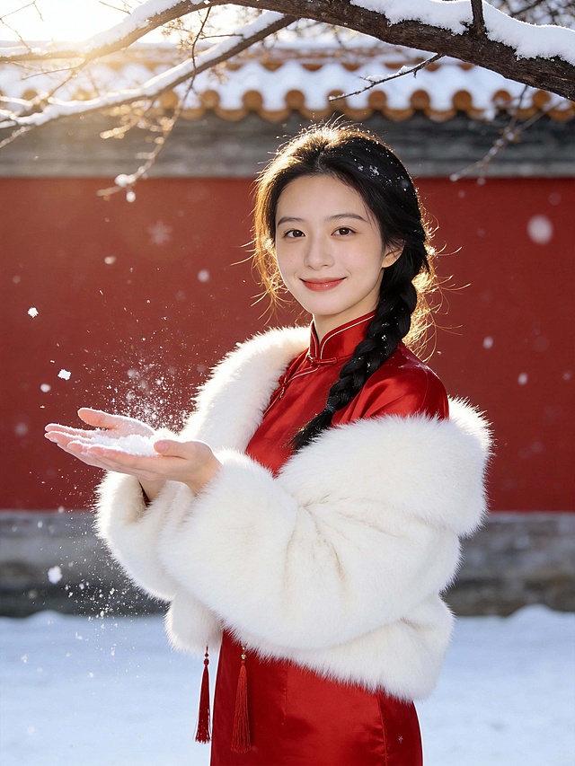 画面里的这个女生在面向镜头,慢慢倒退,背景是四川峨眉山,她站在峨眉山寺庙前,地上、寺庙的屋檐上、台阶上都盖着雪,屋檐下挂着红灯笼,到处都充满着新年氛围。女生用四川方言热情祝福:「马年到略!我在四川峨眉山祝恁娃鸿福齐天,万事都顺意噻!”」,整体画面年味浓郁、氛围感拉满,光影温暖喜庆,适配春节新春氛围。详情