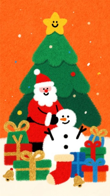 插画风圣诞场景,扁平化设计融合毛发生长质感,拟人化圣诞老人与笑脸星星树顶,搭配礼物与雪景,传递喜庆卡通氛围。