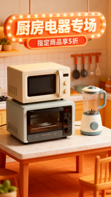 3D微缩厨房场景,霓虹灯招牌点亮促销氛围,暖黄基调传递温馨舒适感,家电陈列精致,节日促销信息清晰突出。