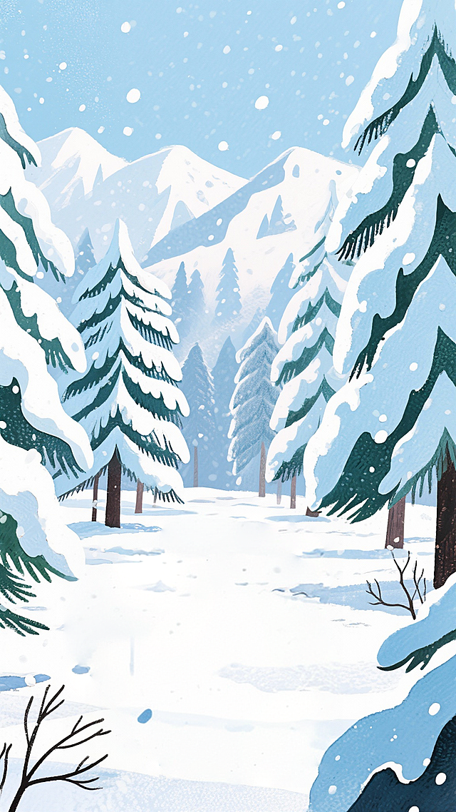 冬季雪景插画,连绵起伏的雪山被厚厚的白雪覆盖,山峰在蓝天的映衬下显得格外壮丽,天空中飘着细小的雪花,阳光洒在雪地上反射出耀眼的光芒,整个画面呈现出一种宁静而纯净的氛围,色彩以蓝白为主,营造出寒冷而美丽的冬日景象。详情