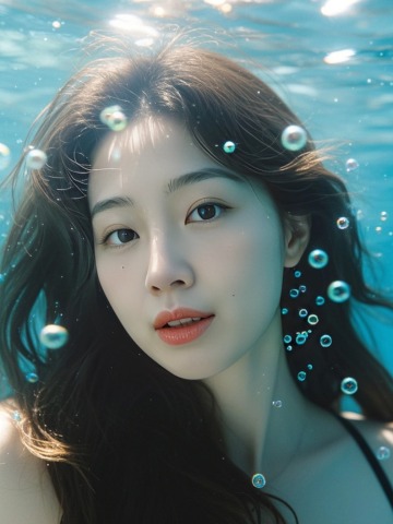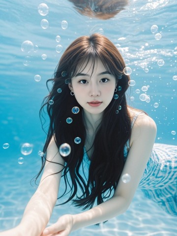 长发少女,水下写真,周围少量气泡装饰,正面视角,清透梦幻氛围,商业摄影
