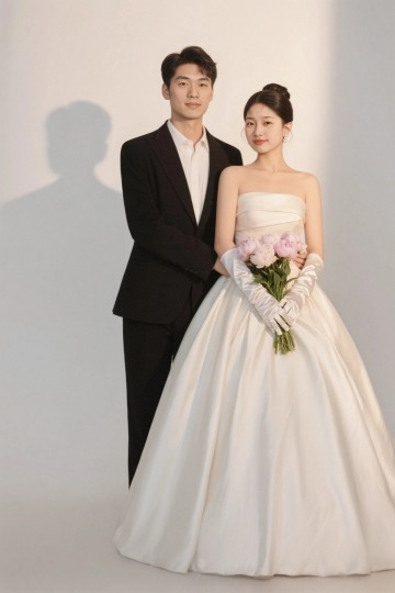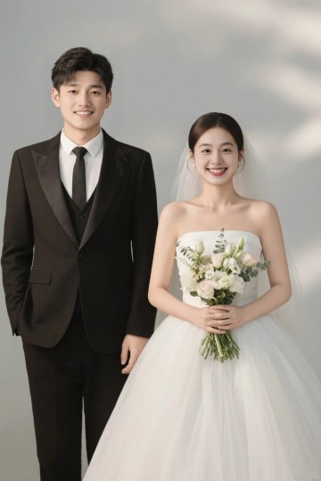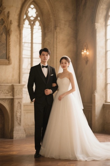 一对新婚夫妇的亲密特写,新娘身着白色蕾丝鱼尾婚纱,头戴带蕾丝花边的白色头纱,手持白色玫瑰花束,棕色长卷发自然垂落;新郎穿着黑色西装,内搭白色衬衫,系黑色领结,胸前佩戴白色胸花,两人面带微笑,额头相抵,眼神充满爱意和幸福。采用柔和的自然光摄影风格,温暖的金色光线从侧上方照射,形成细腻的阴影和柔和的高光,背景虚化处理,突出主体人物的情感互动和清晰的细节质感,整体画面呈现出浪漫、温馨、高雅的氛围。