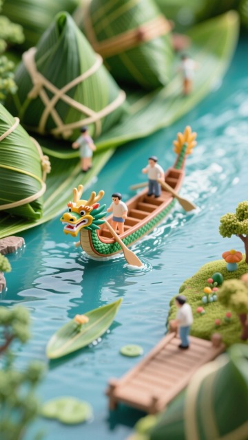 3D微缩艺术风,粘土质感的巨型粽子置于中式庭院,人物互动充满趣味与梦幻感,清新自然,端午节氛围浓厚。
