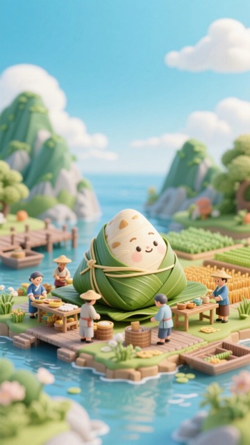 软3D风结合粘土质感,拟人化粽子萌趣十足,色彩清新喜庆,卡通风格呈现端午节氛围。