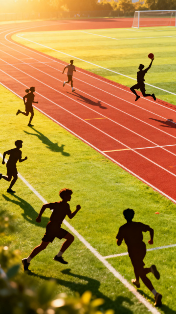 A set of 6 illustrations in a unified flat vector style with bright, cheerful colors and soft gradients, featuring children with round faces, big expressive eyes, and simple, cute clothing details, arranged in a规整 grid layout on a solid color background. Each illustration depicts a different child action: 1. A child sitting cross-legged on the grass, holding an open book with a focused expression, wearing a white shirt and blue shorts, with a small backpack beside them. 2. A child writing in a notebook at a wooden desk, head slightly tilted in concentration, wearing a yellow sweater and gray pants, with a pencil case and eraser on the desk. 3. A child standing upright with a red backpack on both shoulders, hands gripping the straps, smiling confidently, wearing a green shirt and black shorts, with a small lunchbox in one hand. 4. A child with arms wide open, standing on tiptoes as if embracing the wind, wearing a pink dress and white shoes, hair flowing slightly, with small leaves floating around. 5. A child mid-run, legs in a dynamic stride, arms pumping at the sides, wearing a blue tracksuit and sneakers, with a determined expression and hair blowing back. 6. A child kicking a soccer ball, one leg extended behind, arms outstretched for balance, wearing a black and white striped jersey and red shorts, with the ball in mid-air near their foot. All illustrations maintain the same soft lighting, minimal shadows, and playful line work, with each child having distinct hair colors and styles, and small floating elements (leaves, paper airplanes, stars) matching the theme of each action, set against a clean, solid background in a vibrant but harmonious color palette that differs from the original while保持ing the overall cheerful aesthetic.