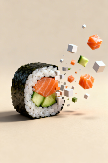 未来感3D风寿司,几何元素解构飞散,虚拟现实粒子效果,呈现科技与美食的碰撞。