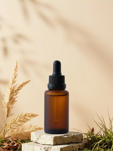 质朴自然肌理与光影交织,木雕风枯木叠岩托起琥珀色精华瓶,轻拟物风果实点缀,营造出优雅文艺的实景感。