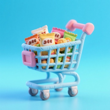 3D风购物车,拟人化商品,塑料质感,可爱卡通风格,节日促销氛围。