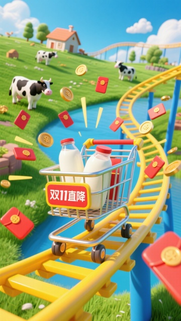 清新3D微缩艺术风,牛奶与大豆在田园中跃动,618狂欢盛典尽显自然魅力。