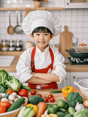 3D风重拟物摄影,实景感厨房中童趣小厨师微笑料理,清新蔬果环绕,温馨可爱,柔和光影营造舒适氛围。