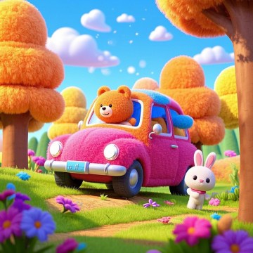 梦幻甜美元素融合软3D风格,毛发生长风树木与粉嫩云朵营造童话森林,虚拟自然中流淌着清澈溪流,传递春日治愈感。