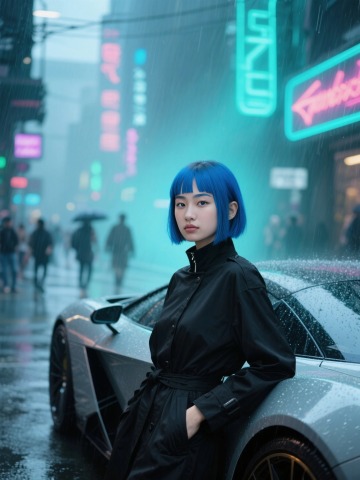 赛博朋克风未来城市,霓虹灯闪烁,蓝发少女雨中倚车,科技感十足。