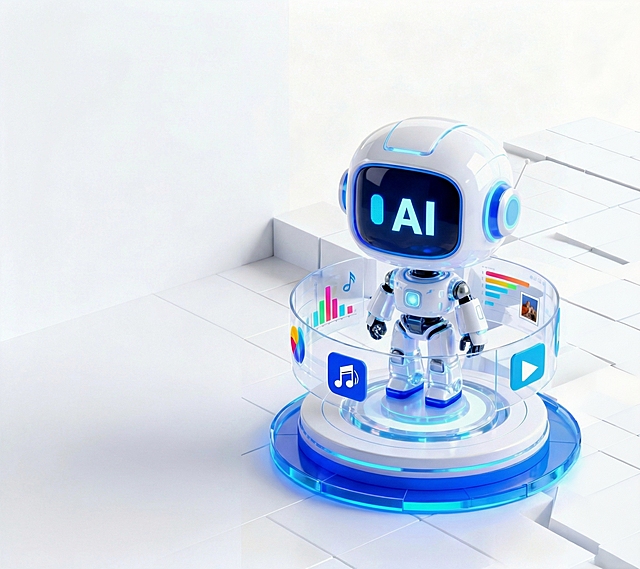 3D渲染,未来科技感,通透玻璃质感,蓝白色调,简约大气的UI头部设计,画面右侧是一个3D人工智能形象,面前有“AI”字体图标,下方为圆形底座,周围环绕数据图形、音乐符号、照片图标、视频播放按钮等元素,地面由高低不平的白色几何板块构成,色彩鲜艳,白色背景,等距渲染,工作室照明,OC渲染,C4D,光线追踪,左侧背景元素留白详情