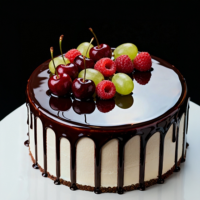 一个精美的草莓蛋糕,白色背景,蛋糕主体使用光滑细腻的黑巧克力替代原奶油材质,表面覆盖着新鲜饱满的红色草莓切片、深红色的小红莓和少量深蓝色的蓝莓,蛋糕侧面整齐排列着切片草莓,顶部和侧面边缘装饰有精致的巧克力花纹,整体呈现出浓郁的巧克力质感与鲜艳水果的对比,光影柔和,色彩真实,立体感强,细节清晰。详情