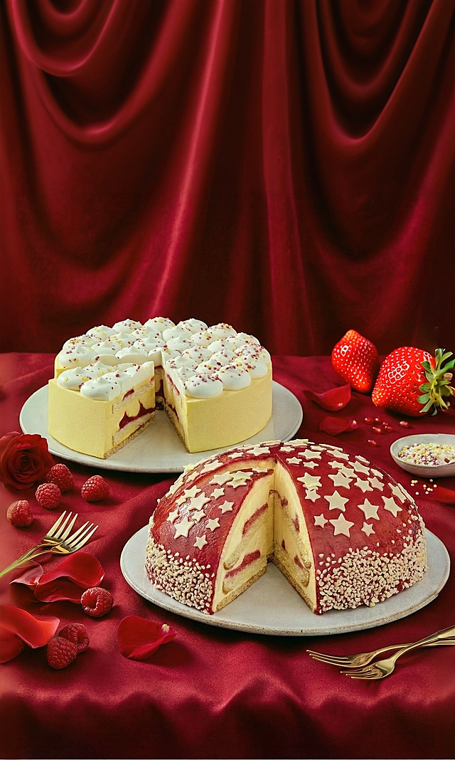 温馨氛围感商业美食摄影风格,画面以深邃暖棕为背景底色,搭配渐变粉橙的桌面,整体色调温暖浓郁且富有层次。 采用平视略俯视的视角,两个主体分别置于画面左上和右下的白色圆盘之上,其中一个主体放在高脚蛋糕架上,另一个放在平盘上,呈自然直立角度,大小适中且错落有致。 主体占画面比例30%,主体上装饰有点燃的螺旋蜡烛、爱心造型装饰与金色糖珠,周围散落红色立体爱心道具、玫瑰花瓣、一颗草莓。 背景运用光影投射出柔和的爱心形光笼罩主体,采用侧逆光结合局部补光,营造出明暗对比强烈的戏剧感,主体与浪漫温馨的场景融为一体,充满甜蜜仪式感。详情