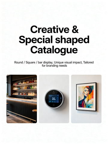 Revise the Creative & Special shaped Displays catalogue page, clearly display the three special-shaped screens: 1. Long bar-shaped strip display, 2. Round circular display, 3. Square display, clearly label each product name. Keep title "Creative & Special shaped", original features "Round / Square / bar display, Unique visual impact, Tailored for branding needs", maintain modern minimalist business style consistent with other pages, all text in English, make product shapes clearly recognizable in layout.