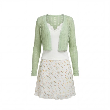 清新柔美,绿意盎然的镂空针织开衫搭配碎花裙,文艺与时尚交融,展现春日舒适面料风。