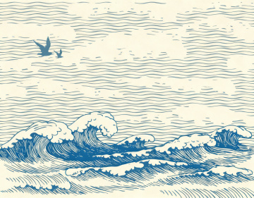 手绘风格的海浪插画,左侧是翻涌的白色浪花,右侧是平静的深蓝色海面,浪花与海面的交界清晰,整体色彩以蓝白为主,笔触具有手绘的纹理感,画面营造出海洋的动态与宁静并存的氛围,构图简洁,突出海浪的自然形态和手绘的艺术质感。