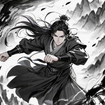水墨风与工笔技法融合,黑衣侠客持剑而立,神情严峻,尽显古典神秘与国潮气韵,故事感十足。