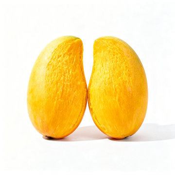 简约现代风格的纯色背景芒果元素图案,单个完整芒果与切半带网格状果肉的芒果组合,芒果呈现鲜亮的橙黄色,表面光滑带有自然光泽和少量水珠质感,整体构图规整对称,无文字无logo无水印,画面干净简洁,突出芒果的形态美感和新鲜质感