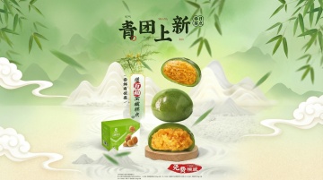 清新淡雅的水墨风插画,融合轻拟物与水彩质感,展现清明时节的柔和与舒适。青团置于竹叶之上,搭配垂柳与远山,传递中式传统意境。