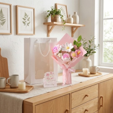 调整产品构图,让手工钩织花束和餐边柜场景更加融合自然,调整比例为1:1,在画面合适位置添加卖点文字"手工钩织花束 母亲节礼物",保持产品清晰,光影协调自然