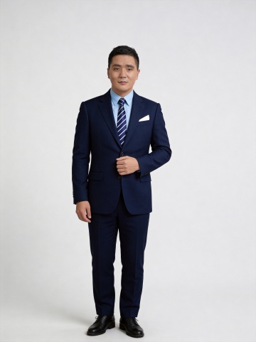 商务感十足的藏蓝色西装,斜条纹蓝白相间领带男性职业形象照,面料质感细腻,实景拍摄呈现高级质感,适合职场精英形象展示。