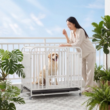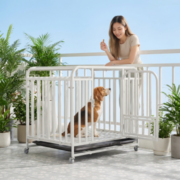 白色不锈钢狗笼,保持物理结构绝对不变,严禁扭曲变形。放置在朝南阳台,周围摆放多种清新绿植,地面是浅灰色小花砖,白色围栏外可见蓝天。自然光柔和漫射,整体画面更清新透亮,低饱和色调,阴影极淡。微俯视三分构图。狗笼内坐一只成年白色萨摩耶,另一位不同的东亚长发美女靠在围栏边,手持零食逗狗,姿态轻松自然,妆容清新。空气通透,光斑在地面浮动,超级清新治愈的家庭绿植角落,商业级4K超清,保持产品结构清晰。