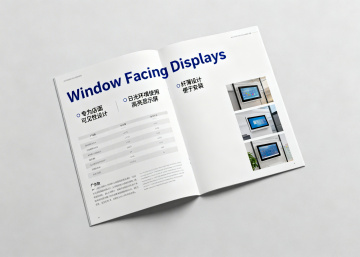 Create a clean professional product catalogue, it includes three special shaped display products: 1. Long bar beverage display 2. Round smart control screen 3. Square art display. Title "Creative & Special shaped Catalogue", text description 'Round / Square / bar display, Unique visual impact, Tailored for branding needs'. Modern minimalist business style. Place the three product images provided in appropriate positions with neat typography, all text in English.