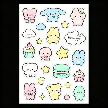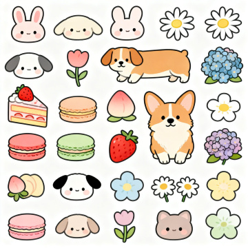 可爱卡通插画风,描边手账元素,融合萌宠、花朵与甜点,清新柔和,充满舒适感与emoji趣味,适合春季主题设计。
