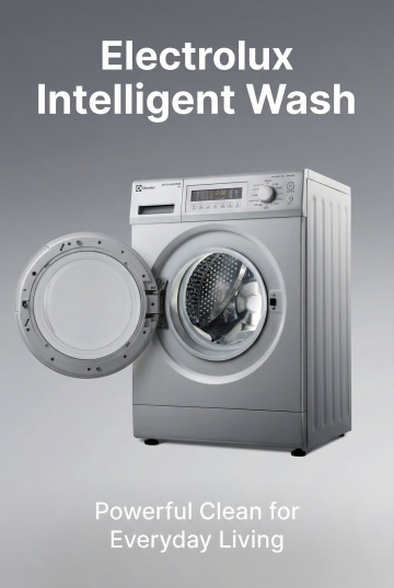 俯视角构图,一台棱角分明的哑光白滚筒洗衣机静置于深邃的午夜蓝渐变背景中,舱门以45度角优雅敞开,露出内部如精密齿轮般交错的银色不锈钢内筒,波浪形洗衣槽在侧逆光下形成明暗交错的几何阴影。顶部控制面板采用悬浮式设计,圆形旋钮泛着冷调金属光泽,LED显示屏正投射出幽蓝的数据光芒,按键排列如琴键般富有韵律感。洗衣机底部与光滑的液态银地面无缝相接,形成完美对称的倒影,地面反射着内筒的机械纹路与控制面板的点点蓝光。整体光线采用三点打光法:主光源勾勒出洗衣机锐利的轮廓线,辅助光凸显哑光与金属的材质对比,背光在背景墙投射出微妙的光晕渐变,营造出未来实验室般的科技静谧感,高清晰度捕捉每一处接缝的精密工艺。