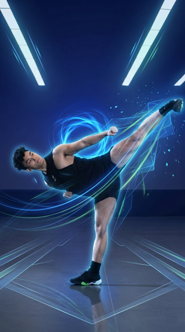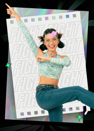 Y2K风+赛博朋克元素融合,霓虹灯色块与像素对话框碰撞,卡通感运动女孩跃动于虚拟现实场景,充满未来感与潮流感的多巴胺燃脂挑战海报。