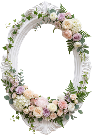 欧式宫廷风花艺镜框,融合复古雕花与柔美花卉,3D重拟物质感,呈现唯美感与浪漫氛围,适合婚礼或节日装饰。