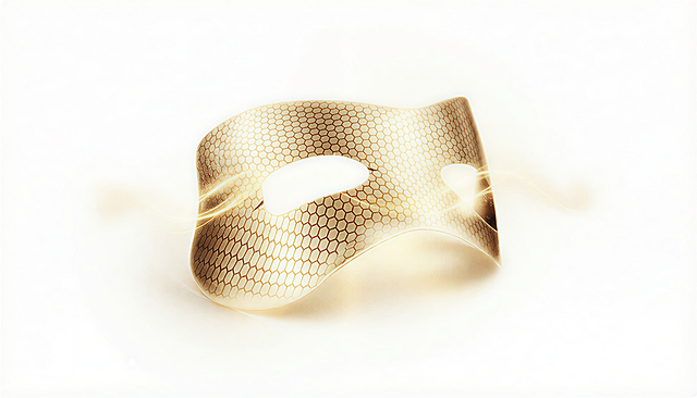 特写镜头,一张贴在人体肌肤上的补水膜布,膜布充满水润光泽,质感细腻通透,水润透亮带有精华液的湿滑反光,细节清晰,产品摄影质感,高清写实详情