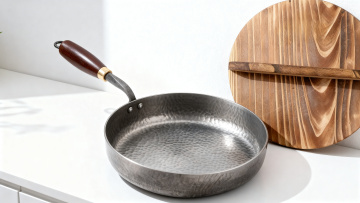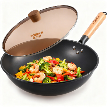现代工业风厨房中,中式炒锅翻炒香辣蟹,金属质感与光影交织,重拟物设计凸显科技感与商务气息。