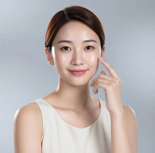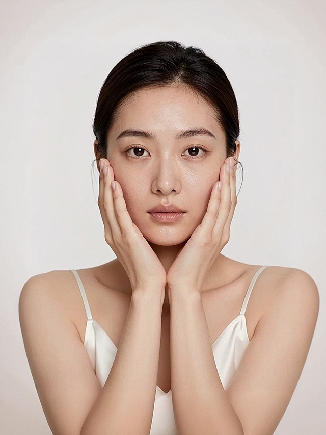 高清写实人像摄影,柔和自然光从侧前方照射,营造明亮通透的氛围,浅米色背景简洁干净。年轻女性闭眼享受护肤时刻,束起的浅棕色头发露出光洁额头,面部肌肤白皙水润,带有自然光泽和细腻质感,眉形精致,唇色淡雅。双手以轻柔姿态轻抚脸颊两侧,修剪整齐的浅粉色指甲,展现温柔呵护的动态。整体画面聚焦于人物上半身,构图饱满,光影过渡自然,色彩清新柔和,传递出舒适、放松、专业的高端护肤体验感。详情