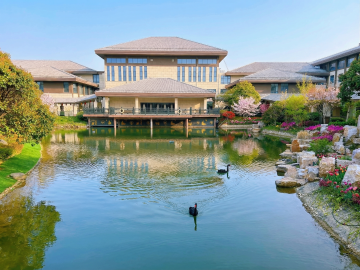 高端酒店外观夜景,现代简约建筑风格,主体为高耸的米灰色玻璃幕墙大楼,顶部及裙楼边缘有温暖的金黄色灯带勾勒轮廓,大量明亮的窗户透出内部灯光。建筑前方有平静的水池,完美倒映出建筑的灯光与轮廓,水面泛着金色涟漪。周围点缀着茂密的绿色树木,底层设有带遮阳伞的露天休息区。天空呈现深邃的蓝紫色渐变色,营造出宁静、奢华、大气的氛围,专业摄影级画质,清晰的细节和光影层次,高分辨率。