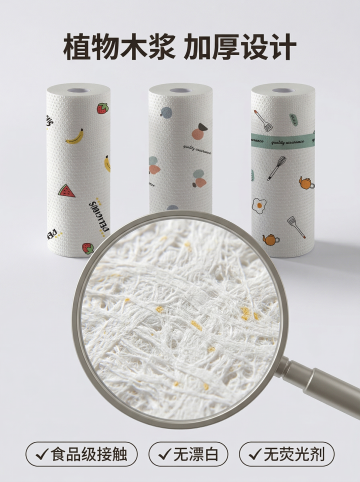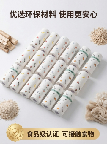 [画面元素] 三款不同印花的一次性抹布居中展示,放置在干净整洁的浅灰色厨房台面上,台面上散落少许新鲜木浆棉原料,阳光从侧面窗户洒入,形成柔和自然光影,整体干净明亮,产品主体清晰突出